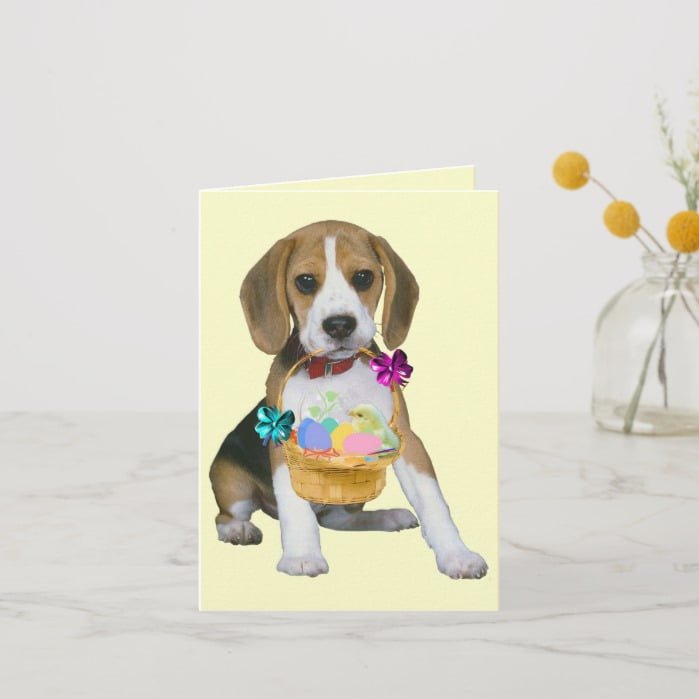 Beagle Easter – Customized Holiday Card – This beagle puppy loves the fun of the Easter Egg Hunt. If your are looking for a cute holiday card for Easter and your favorite dog breed is the Beagle, you will enjoy this little pooch.