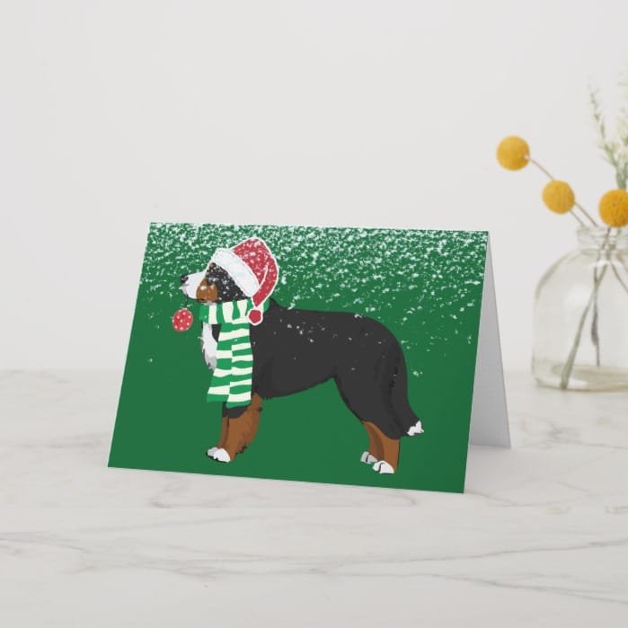 Custom Christmas Bernese Mountain Holiday Dog – Festive Personalized Christmas Holiday Bernese Mountain Dog dressed in santa hat and green and white scarf holding red polka dot christmas ornament in its mouth. Cute christmas gift idea for berner lovers!