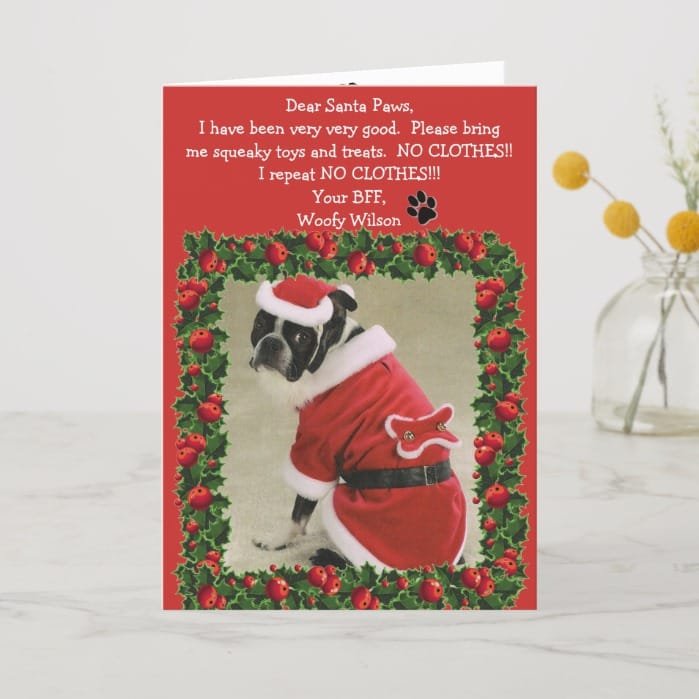 Funny Dog Doesn’t Want Clothes Christmas Card – Find similar items in my “Christmas-Funny” or “Christmas-Dogs” Collection.