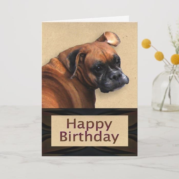 Boxer Dog Birthday Card – Burma the Boxer dog has a wonderfully noble air about her for this dog lover’s design. Who could resist that face? Template provided to modify inside verse. Original art, photography and design by Anura Design Studio.