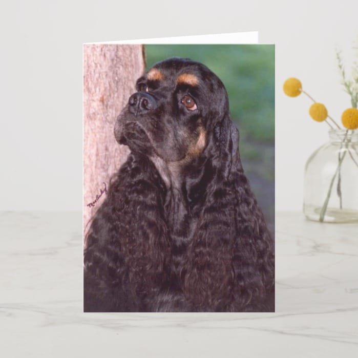 Black & tan Champion Cocker Spaniel greeting card – Black & tan Cocker Spaniel Champion by, Karen Mac Auley