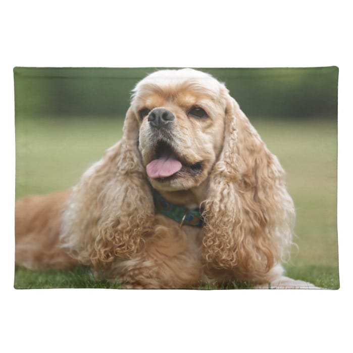Cute Cocker Spaniel Cloth Placemat – Bullitt, our one and only cocker spaniel showdog, chilling out in the backyard.