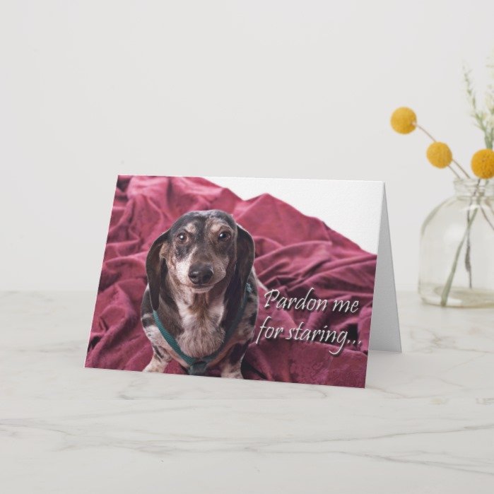 Pardon Me For Staring Birthday Card – Send a sweet birthday greeting with this cute Dashshund birthday card. This adorable pooch is staring in disbelief at how youthful your lucky birthday pal is despite his or her actual calandar age. Great for the dog lover in your life.Send a sweet birthday greeting with this cute Dachshund birthday card. This adorable pooch is staring in disbelief at how youthful your lucky birthday pal is despite his or her actual calendar age. Great for the dog lover in your life.