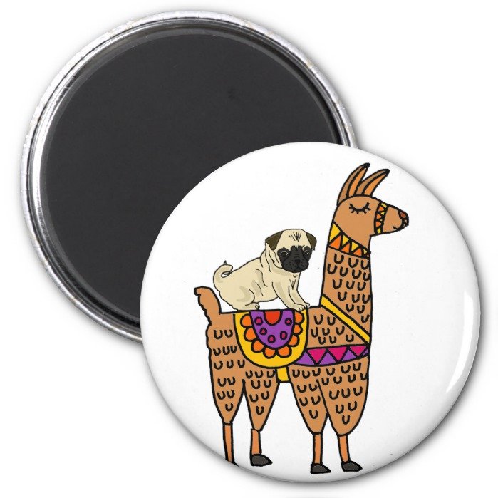 Funny Pug Dog Riding Llama Cartoon Magnet – Cute fun humorous unique pug puppy dog riding llama original art design is fantastic for llama lovers and pug dog lovers.